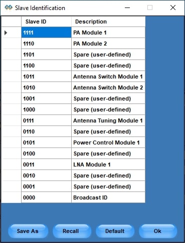PGY-RFFE Software provides the flexibility to view the decoded data in the symbol table. RFFE specification documents provide guidelines to describe the Slave IDs. PGY-RFFE software has the default slave ID table. However, the user can edit the default table and apply the custom described slave IDs for easy analysis of protocol activities. This symbol table is used for easy trigger setup, protocol analysis, filter, and search features.