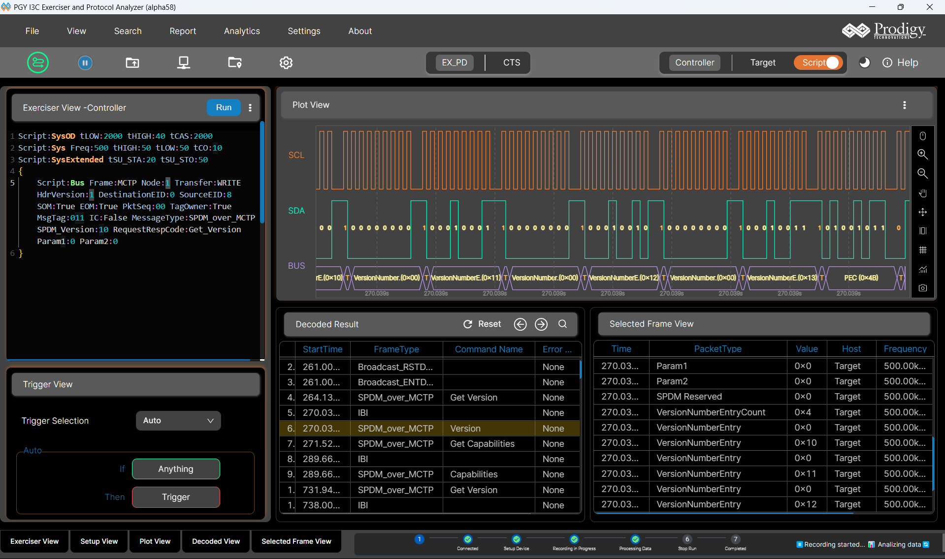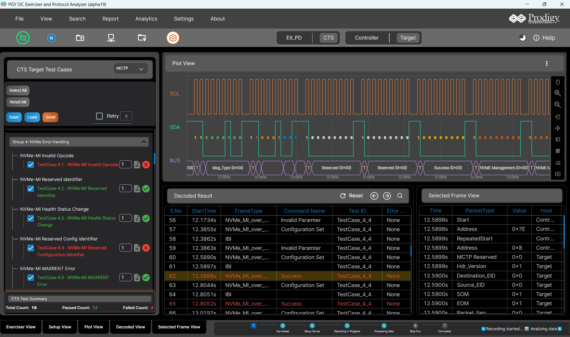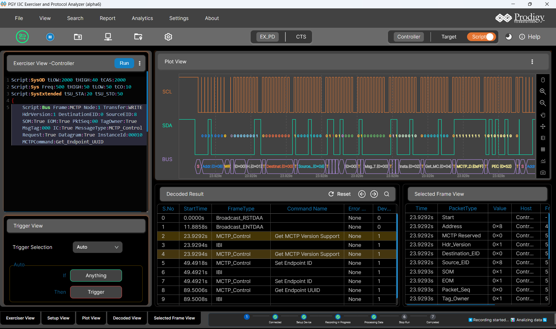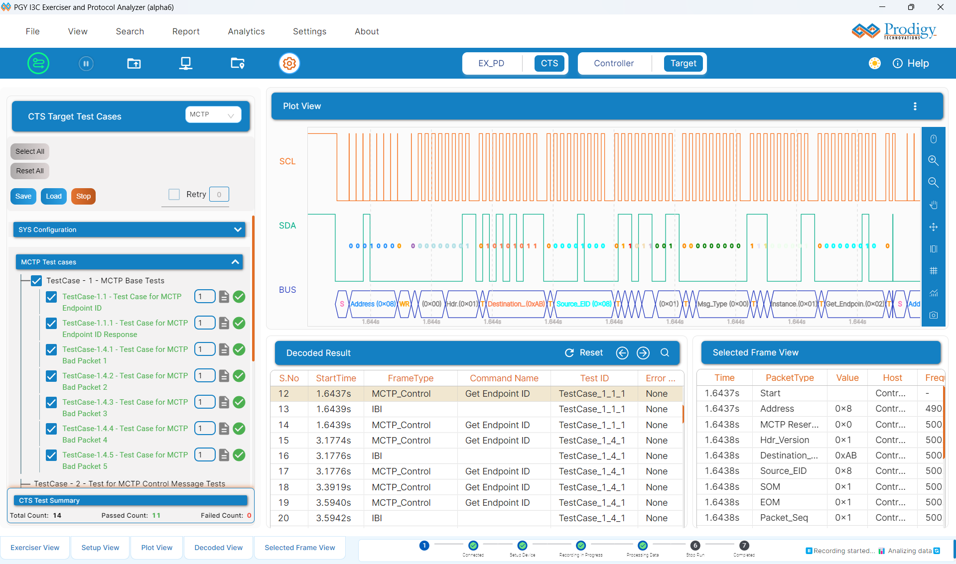 The PGY-I3C-EX-PD provides complete MCTP over I3C decode including message type identification, endpoint addressing, packet assembly across multi-packet messages, and error detection. An optional MCTP exerciser generates MCTP traffic over the I3C physical layer for endpoint validation.