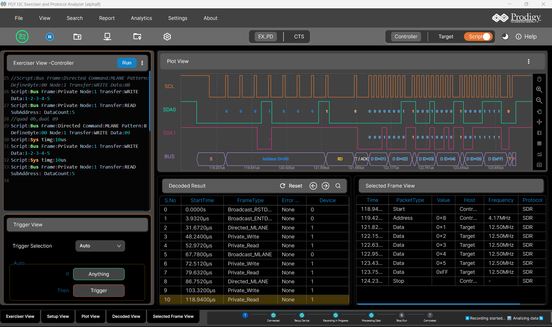 The PGY-I3C-EX-PD can operate simultaneously as an Analyzer and Exerciser. In exerciser mode, it generates I3C traffic - configurable Controller, Secondary Controller, or Target - allowing engineers to validate DUT behavior without needing a separate traffic source. In analyzer mode, it passively captures and decodes all I3C bus activity in real time, displaying waveforms, protocol listings, and state machine transitions in a unified GUI.